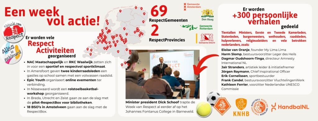 Sinds 2006 organiseert de Respect Foundation de jaarlijkse nationale bewustwordingscampagne de Week van Respect (van 9 t/m 15 november 2026). Jaarlijks bereiken we 800.000+ jongeren! We werken samen met 69+ gemeenten, honderden gastsprekers, vele partners (maatschappelijke organisaties, financiers en sportbonden) en duizenden scholen/klassen (po, sbo, vo, vso, mbo en isk), sportclubs, jongerenwerkorganisaties en bso’s in heel Nederland.