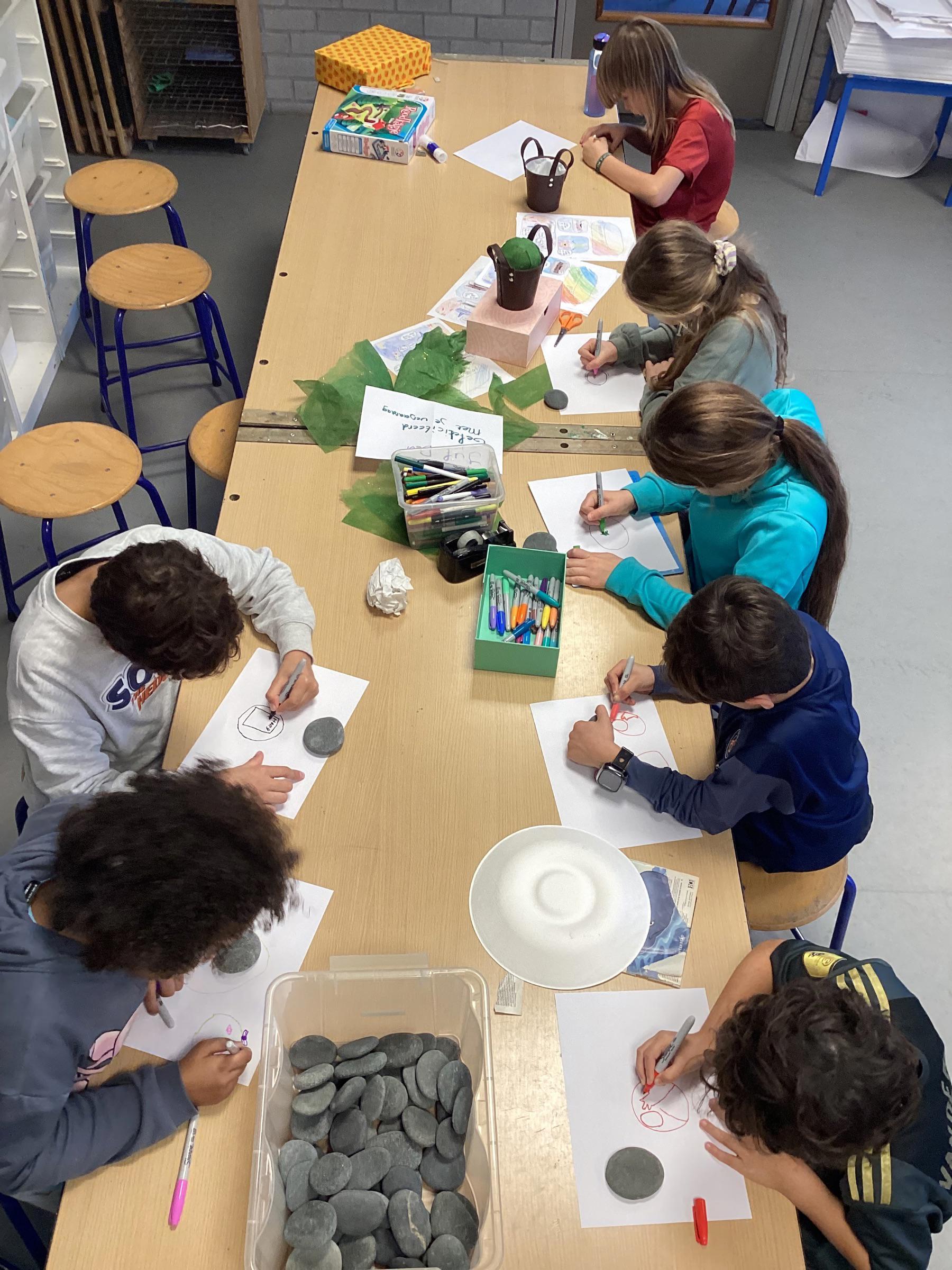 Na de vergadering maakten ze een eigen respect-tegel. Op een canvasdoek werkten ze hun ideeën uit met stiften. Elke tegel is uniek en gaat mee terug naar de BSO, zodat ze het gesprek daar kunnen voortzetten.